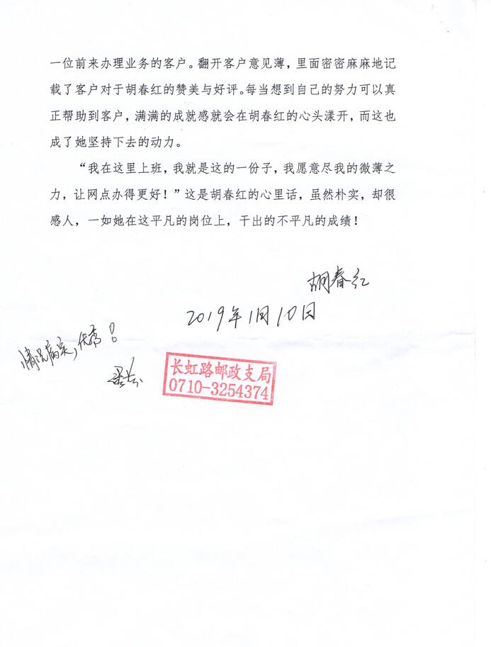 還有一次,一對老夫妻來網(wǎng)點(diǎn)辦理業(yè)務(wù),老大大心臟病突發(fā),動彈不得,胡春紅二話沒說撥打了120急救電話,又是遞上熱水又是幫忙攙扶她到座椅上休息,然后,她想也沒想就跑到最近的藥店,自費(fèi)買了一盒速效救心丸,在稍事休息后老太大有所好轉(zhuǎn)事后,老兩口多次來到網(wǎng)點(diǎn)要把藥費(fèi)還給胡春紅,都被她拒絕了,最終,老大大親自寫了整整兩頁紙的感謝信,交到了胡春紅手中。將客戶遺失在網(wǎng)點(diǎn)的物品及時收起來,妥善保管,待客戶來時物歸原主;主動給客戶講解宣傳存款政策,幫助網(wǎng)點(diǎn)提升業(yè)績……這樣的事跡還有很多,胡春紅用她的熱情、真誠感染著每一位前來辦理業(yè)務(wù)的客戶。翻開客戶意見薄,里面密密麻麻地記載了客戶對于胡春紅的贊美與好評,每當(dāng)想到自已的努力可以真正幫助到客戶,滿滿的成就感就會在胡春紅的心頭漾開,而這也成了她堅持下去的動力。“我在這里上班,我就是這的一份子,我愿意盡我的微薄之力,讓網(wǎng)點(diǎn)辦得更好!”這是胡春紅的心里話,雖然樸實(shí),卻很感人,一如她在這平凡的崗位上,干出的不平凡的成績!